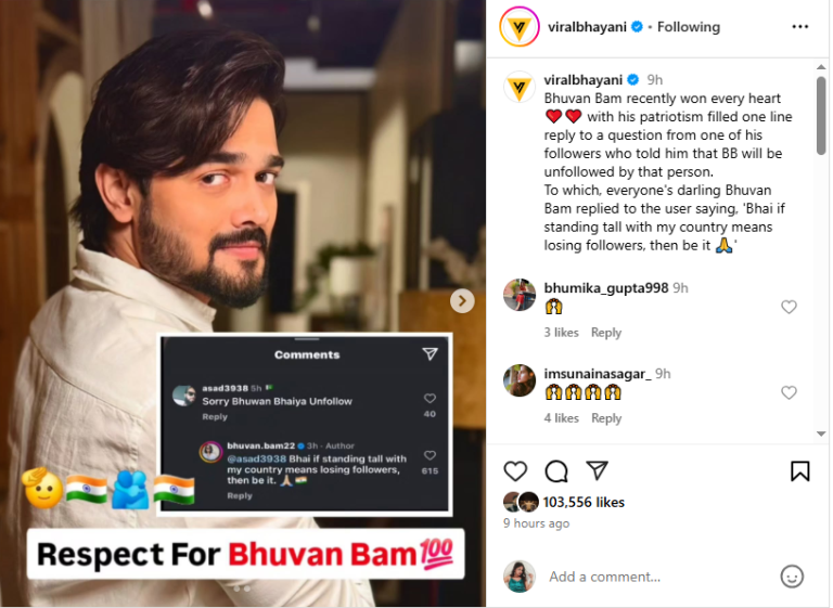 इस कमेंट पर भुवन बाम ने बेहद ही ख़ास प्रतिक्रिया दी, उन्होंने लिखा, “अगर इस समय अपने देश के साथ खड़े रहने के लिए मुझे अपने फॉलोअर्स तक खोने पड़े, तो ये भी देश के लिए कुर्बान हैं।” भुवन का यह जवाब तेजी से वायरल हो गया और सोशल मीडिया पर लोग उनकी सराहना करने लगे। कई यूजर्स ने उन्हें ‘सच्चा देशभक्त’ बताते हुए उनके समर्थन में कमेंट किए।