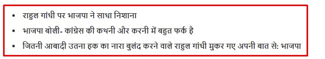 भाजपा ने कांग्रेस के तेलंगाना उम्मीदवारों की लिस्ट का विश्लेषण करते हुए राहुल गांधी के 'जितनी आबादी उतना हक' के दावे को लेकर राहुल गांधी पर सच नहीं बोलने और पिछड़ी जाति के साथ विश्वासघात करने का आरोप लगाया है।