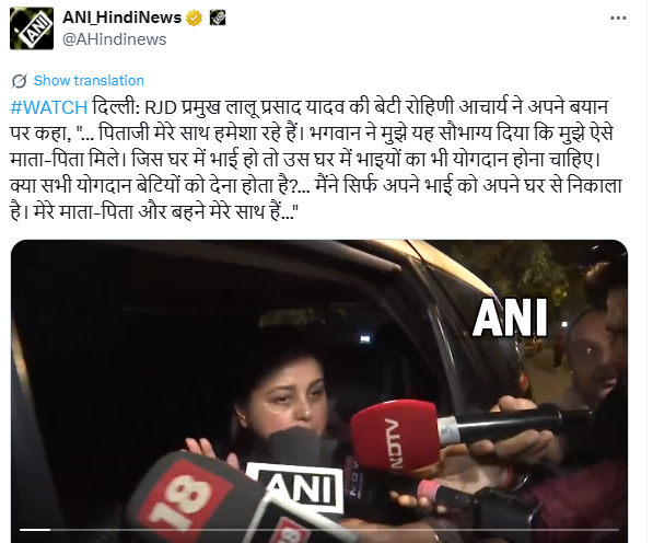 RJD प्रमुख लालू प्रसाद यादव की बेटी रोहिणी आचार्य ने अपने बयान पर कहा, "पिताजी मेरे साथ हमेशा रहे हैं। भगवान ने मुझे यह सौभाग्य दिया कि मुझे ऐसे माता-पिता मिले। जिस घर में भाई हो तो उस घर में भाइयों का भी योगदान होना चाहिए। क्या सभी योगदान बेटियों को देना होता है? मैंने सिर्फ अपने भाई को अपने घर से निकाला है। मेरे माता-पिता और बहने मेरे साथ हैं."