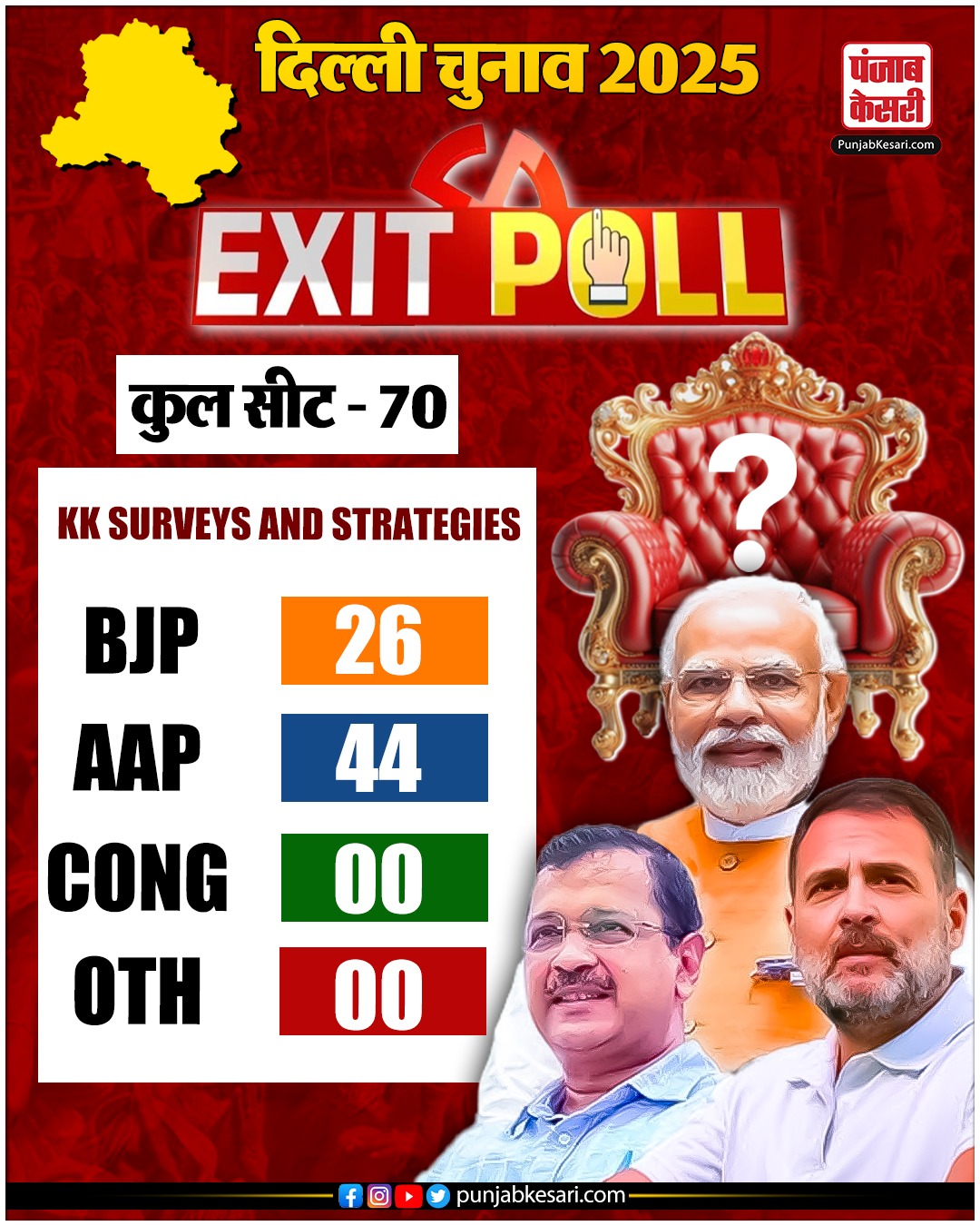 P-MARQ एग्जिट पोल के मुताबिक, भाजपा को 39-49 विधानसभा सीटें, AAP को 21-31 सीटें और कांग्रेस को 0-1 सीट मिलने की संभावना है। मैट्रिज के एग्जिट पोल ने भाजपा और AAP के बीच कांटे की टक्कर की भविष्यवाणी करते हुए कहा कि भाजपा को 35-40 सीटें, AAP को 32-37 सीटें और कांग्रेस को एक सीट मिलने की संभावना है। पीपुल्स पल्स एग्जिट पोल ने भाजपा को 51-60 सीटें और AAP को 10-19 सीटें मिलने का अनुमान लगाया पीपुल्स इनसाइट एग्जिट पोल ने अनुमान लगाया कि भाजपा 40-44 सीटें, आप 25-29 सीटें और कांग्रेस 0-1 सीट जीत सकती है। वीप्रेसिड एग्जिट पोल ने अनुमान लगाया कि आप 46-52 सीटें, भाजपा 18-23 सीटें और कांग्रेस 0-1 सीट जीत सकती है।