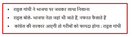 राहुल गांधी ने कहा, ''वह आपके हिस्से का पैसा अडानी जी की जेब में डालते हैं, हम गरीबों की जेब में पैसा डालते हैं। हिमाचल प्रदेश, कर्नाटक और राजस्थान की जनता यह सच्चाई जानती है।” उन्होंने कहा, ”कांग्रेस पार्टी राजस्थान में जाति जनगणना सर्वेक्षण कराएगी। जैसे ही केंद्र में कांग्रेस की सरकार आएगी, हम जाति जनगणना शुरू कर देंगे। हम भारत की रीढ़, भारत के पिछड़े वर्ग के लोगों को उनका अधिकार सौंपना चाहते हैं।” राहुल ने कहा, “भाजपा नेता जहां भी जाते हैं, नफरत फैलाते हैं। वे एक धर्म के लोगों को दूसरेे धर्म वालों से, एक जाति के लोगों को दूसरी जाति के लोगों से लड़ाते हैं और उसका फायदा उठाते हैं। दूसरी तरफ कांग्रेस पार्टी लोगों के मन का इलाज करती है। यह नफरत के बाजार में 'मोहब्बत की दुकान' खोलती है। यह फर्क कर्नाटक के लोग अच्छी तरह समझते हैं, इसलिए उन्होंने कांग्रेस की सरकार बनाई और नफरत फैलाने वाली भाजपा को सत्ता से उतार दिया।“ उन्होंने कहा, ”राजस्थान में पुरानी पेंशन योजना से पांच लाख परिवार लाभान्वित हुए हैं। हमने 3,600 अंग्रेजी माध्यम स्कूल, 309 नए कॉलेज और नौ नए विश्वविद्यालय खोले हैं।”