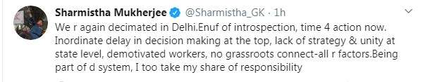 चुनाव परिणाम आने के बाद शर्मिष्ठा ने ट्वीट किया, “दिल्ली में हमारा एक बार फिर से पतन हुआ। आत्मनिरीक्षण बहुत हो चुका, अब कार्रवाई का वक्त है। शीर्ष पर निर्णय लेने में देरी, रणनीति और राज्य स्तर पर एकता में कमी, हतोत्साहित कार्यकर्ता, जमीनी स्तर पर जुड़ाव में कमी- ये सभी कारक रहे हैं। सिस्टम का हिस्सा होने के नाते, मैं अपने हिस्से की जिम्मेदारी लेती हूं।”