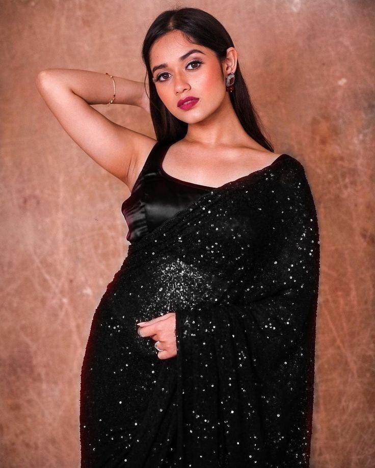 जन्नत ने इसमें ब्लैक कलर की नेट वाली साड़ी को डीप नेक ब्लाउज के साथ पेयर किया है।