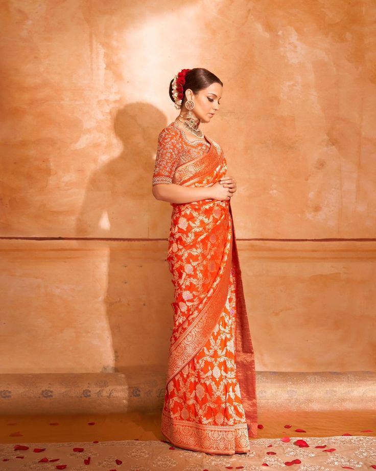 ऑरेंज बनारसी साड़ी के साथ कढ़ाई वाले ब्लाउज में कंगना बेहद ही खूबसूरत लग रही हैं