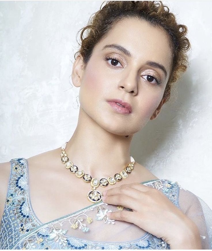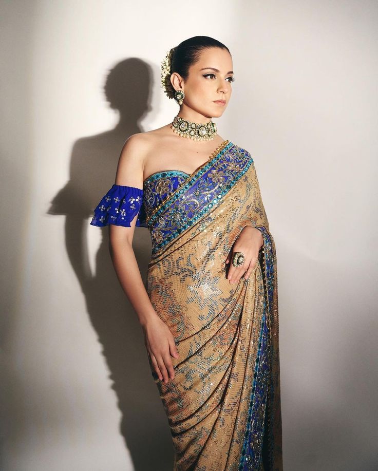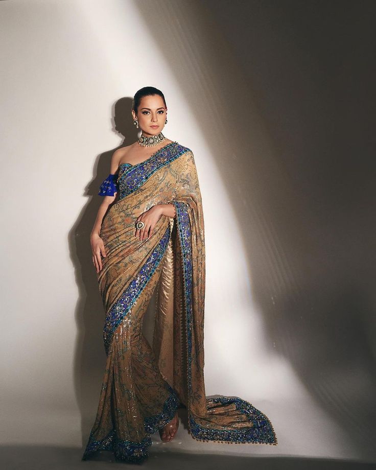 गोल्डन एम्ब्रोयडरी वाली साड़ी पर ब्लू बॉर्डर के साथ ऑफ-शोल्डर ब्लाउज में कंगना किसी रानी से कम नहीं लग रही हैं