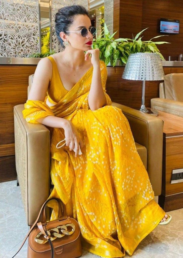 कंगना का येलो सॉफ्ट जॉर्जेट साड़ी लुक और उसके साथ स्लीवलेस ब्लाउज आपकी वार्डरॉब के लिए एक इंस्पिरेशन हो सकता है
