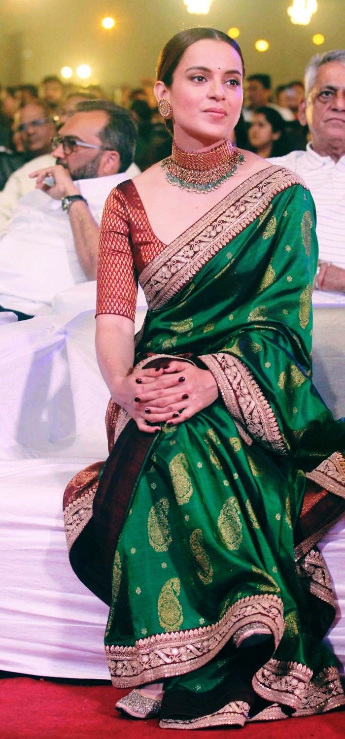 ग्रीन बनारसी सिल्क साड़ी के साथ मेहरून हॉफ-स्लीव ब्लाउज में कंगना बहुत ही प्यारी लग रही हैं