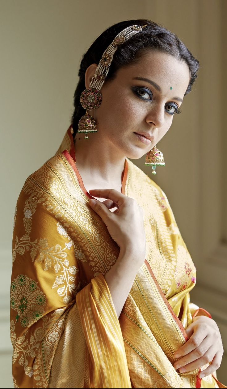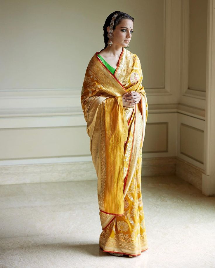 कंगना का मस्टर्ड बनारसी साड़ी और ग्रीन स्लीवलेस ब्लाउज में यह लुक एलेगन्स का परफेक्ट एक्साम्पल है