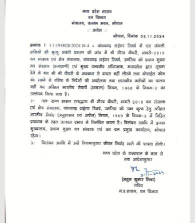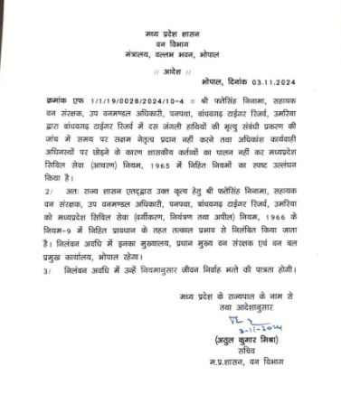 वहीं आज रिव्यू बैठक के बाद वन विभाग को एलिफेंट टॉस्क फोर्स गठित करने के निर्देश दिए और बांधवगढ़ टाइगर रिजर्व के फील्ड डायरेक्टर गौरव चौधरी को सस्पेंड कर दिया। इसके साथ उप वनमंडल अधिकारी सहायक वन संरक्षक (ASF) फतेसिंह निनामा को भी सस्पेंड किया है। जो घटना से पहले छुट्टी पर गए थे और जानकारी मिलने पर भी वापस नहीं लौटे। इसे काम में लापरवाही मानते हुए सरकार ने उन्हें सस्पेंड कर दिया। बता दें, गौरव चौधरी घटना से पहले छुट्टी पर गए और जानकारी मिलने पर वापस नहीं लौटे, जबकि फतेसिंह निनामा पर लापरवाही और समय पर नेतृत्व न देने का आरोप हैं।