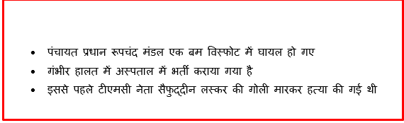 एसपी ने कहा, पंचायत प्रधान रूपचंद मंडल एक बम विस्फोट में घायल हो गए। उन्हें गंभीर हालत में अस्पताल में भर्ती कराया गया है।