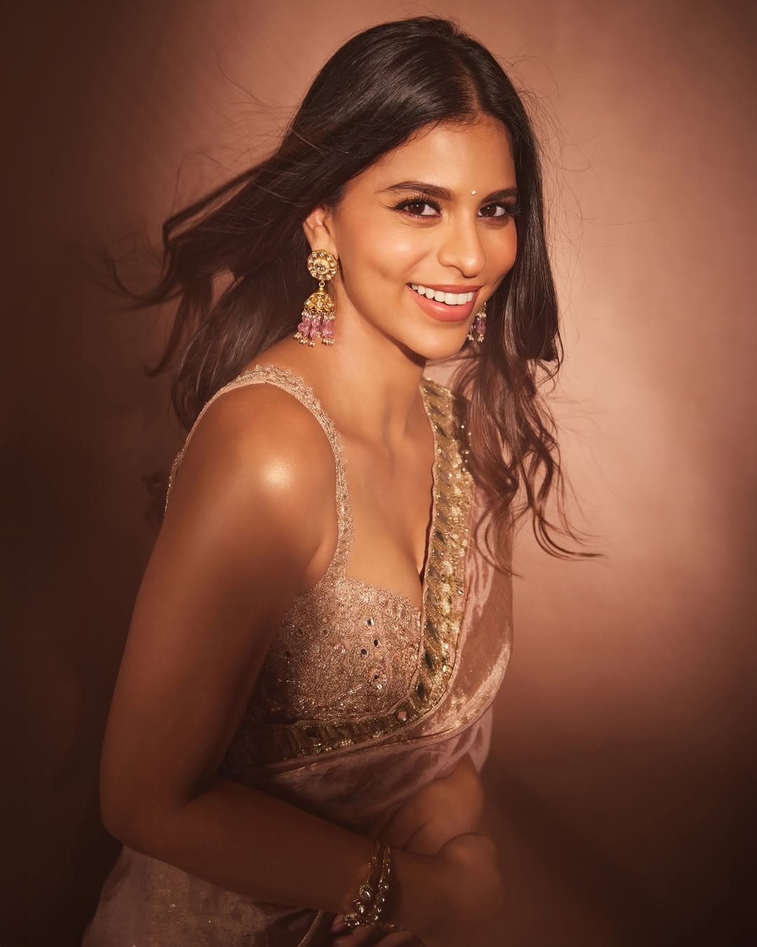मिरर वर्क से सजी सुहाना खान की गोल्डन स्कैलप बॉर्डर वाली पेस्टल पिंक साड़ी देखने में ही बेहद रिफ्रेशिंग लग रही है।