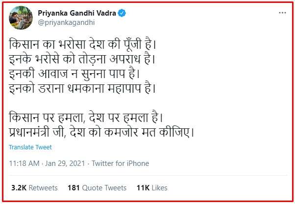 कांग्रेस महासचिव प्रियंका गांधी वाद्रा ने भी प्रधानमंत्री पर निशाना साधा और कहा कि किसानों को ‘डराना-धमकाना’ महापाप है। उन्होंने ट्वीट किया, ‘‘किसान का भरोसा देश की पूंजी है। इनके भरोसे को तोड़ना अपराध है। इनकी आवाज न सुनना पाप है। इनको डराना धमकाना महापाप है। किसान पर हमला, देश पर हमला है। प्रधानमंत्री जी, देश को कमजोर मत कीजिए।’’