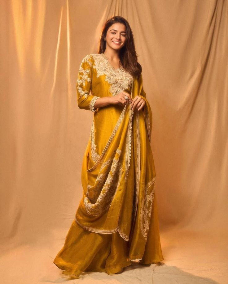 एक्ट्रेस ने इसमें सिल्क वाला प्लाजो सूट पहना है, जिसके गले पर कढ़ाई की गई है।