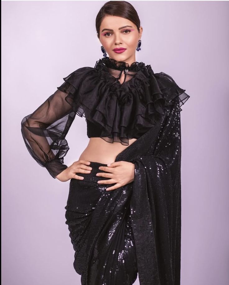 रुबीना ने इसमें ब्लैक रफ्फल साड़ी को ब्लेट और स्लीवलेस ब्लाउज के साथ पेयर किया है।